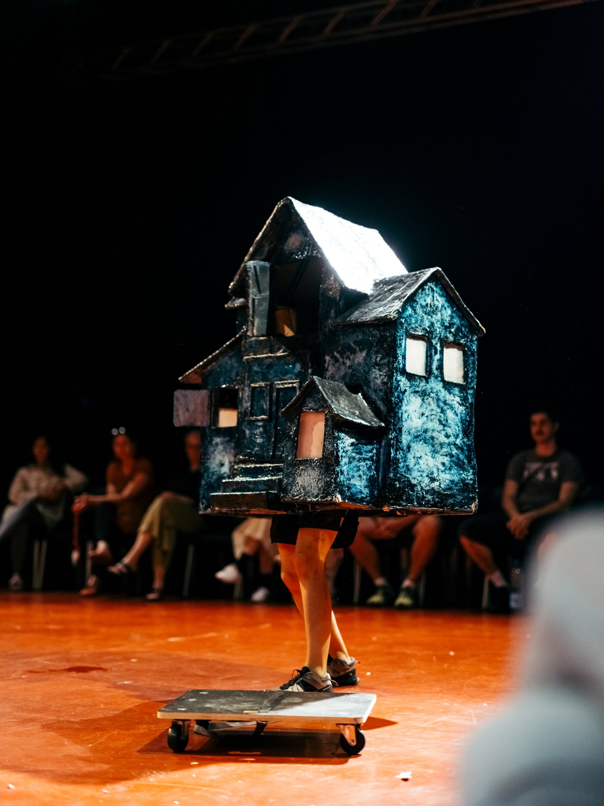 Som svar på en värld där land, språk och folklore har blivit handelsvaror omger sig Nüganen, Sova och Kisling med is. Publiken uppmanas att ta hand om isföremål, medan droppande ispaneler blir tyngdpunkt. Föreställningen utvecklas som en serie kedjereaktioner som Nüganen binder ihop som berättare. Hon föreslår flera perspektiv på lokalitet genom att låta sig förvandlas mellan karaktärer som en fastighetsmäklare, en auktionsförrättare och en turist. ”Ash, horizon, riding a house” utforskar hur identitet, som något format av geografi, kan öppna upp utrymme för flöde, rörelse och transformation. Mot bakgrund av konstant droppande, upplöses förväntningen på beständighet. Efter is kommer vatten, och smältning blir en motståndshandling: mot kontroll och önskan att erövra.